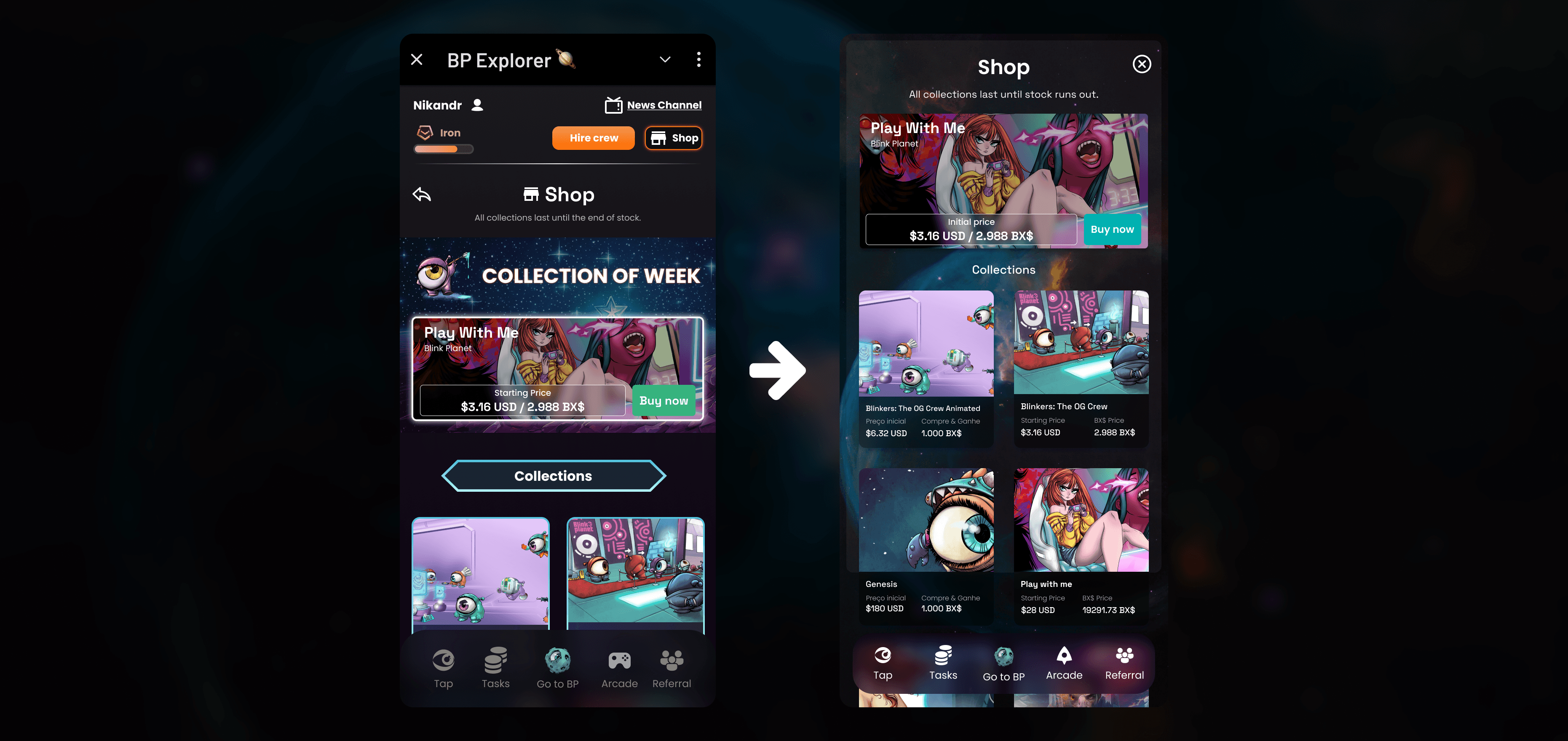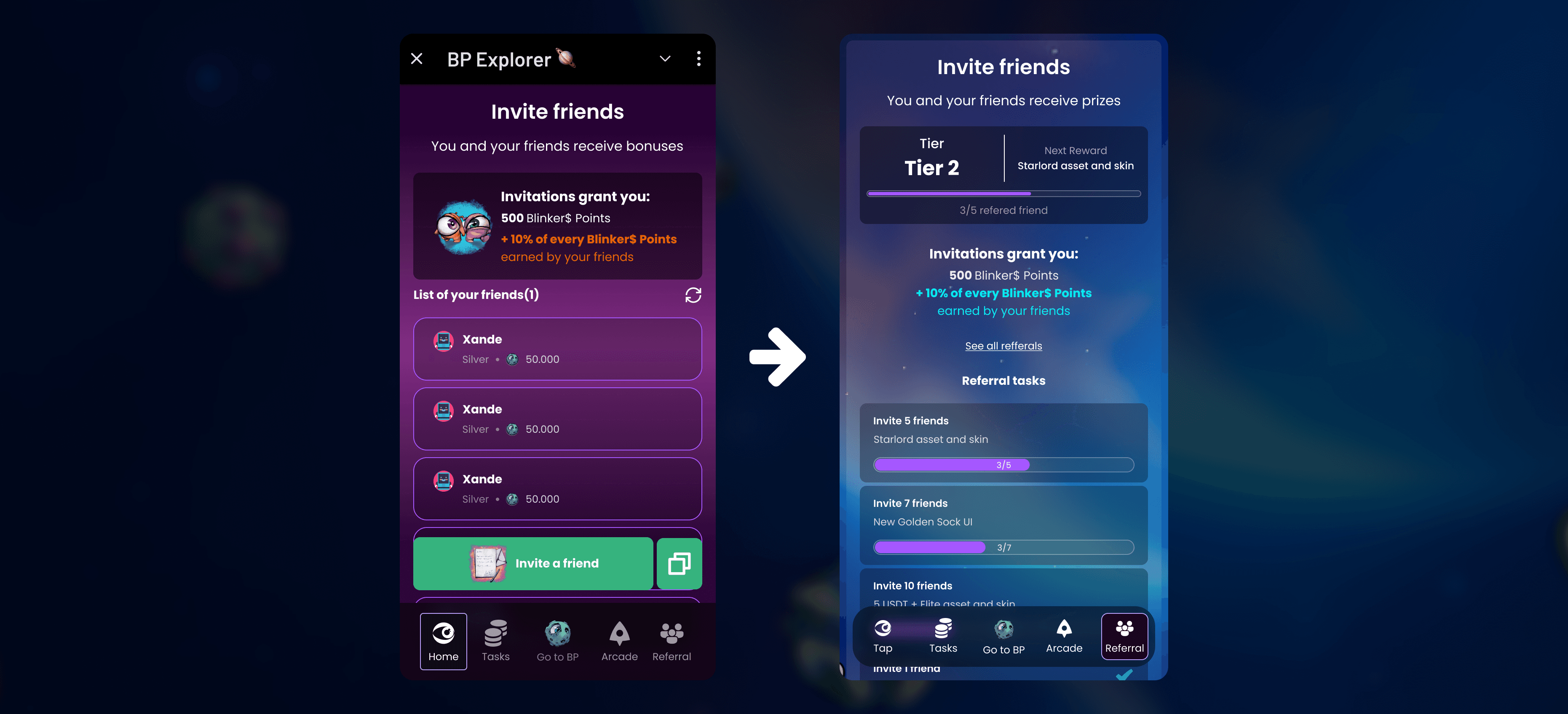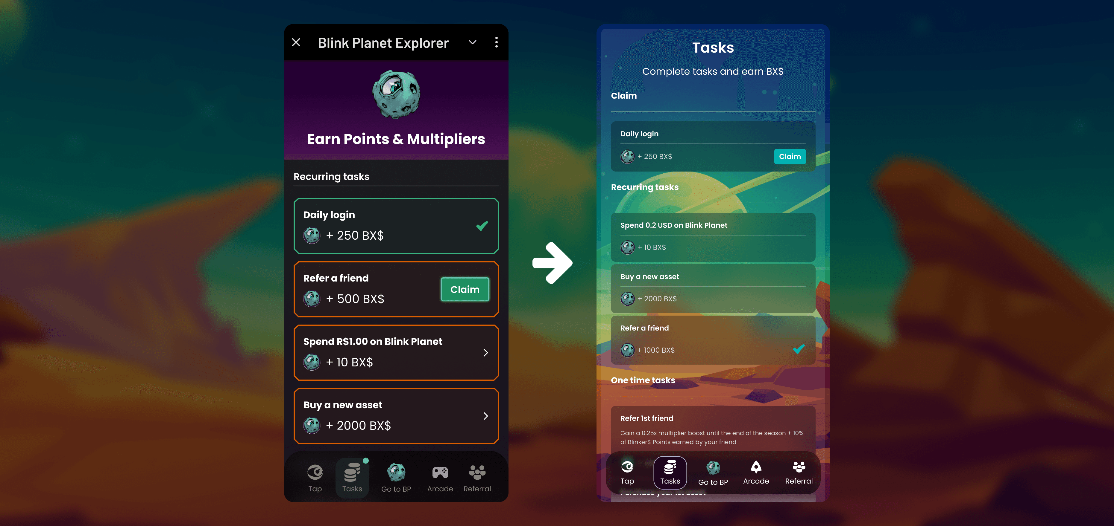 As a primary driver for BX$ accumulation, the tasks screen was redesigned with a minimalist approach. We elevated the visual polish and graphic elements to enhance the perceived value of the interface, providing a more premium and refined user experience.
