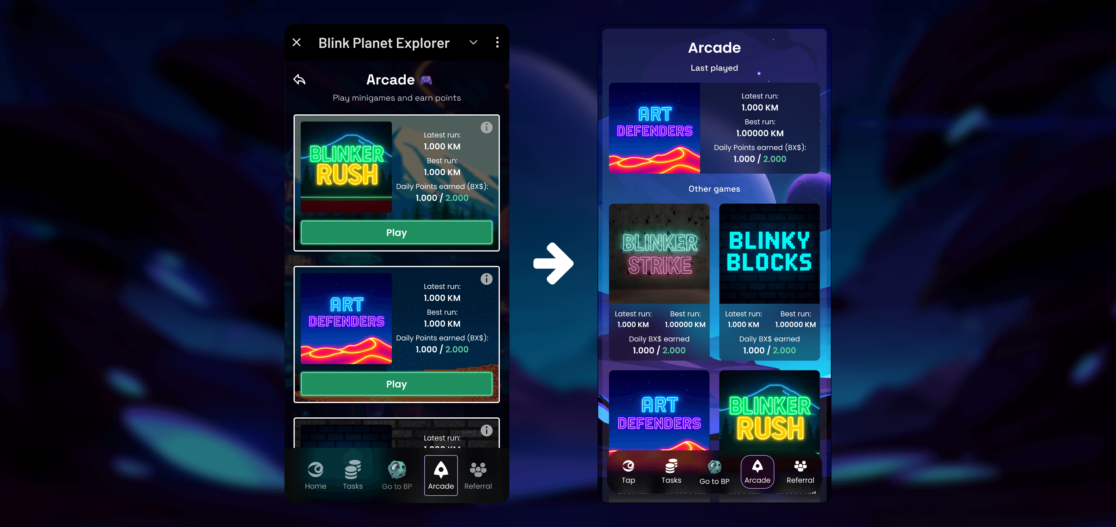 We overhauled the arcade section to establish a more refined aesthetic and better visual organization. The redesign focused on eliminating visual noise and emphasizing essential content, resulting in a cleaner and more efficient interface.